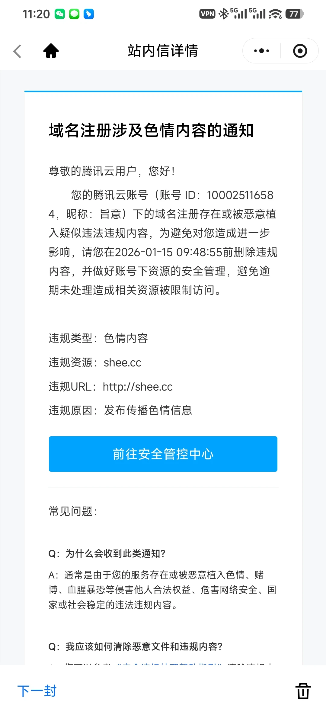 腾讯通知,域名涉及色情内容。我试了一下,主域名进入后确实会弹。在重新进入后不弹了,我以为是偶尔的DNS劫持。今天发现又弹相同的网页,还是弹了一次又不弹了。 以前从没有这个问题,想了一下最近的改动,怀疑是frp的问题,宝塔商店的frp 经常崩溃无法打开,使用docker装了最新版本的frp。
